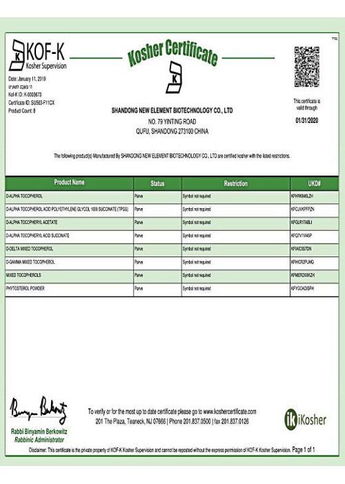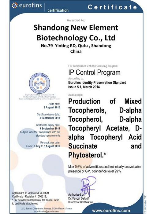 Situat a Qufu City, Xina, la ciutat natal de Confuci. L'empresa New Element Biotech és un fabricant professional de fonts establert el 2015. Produïm 2000 tones de vitamina E natural anualment. Els nostres productes principals són diversos tipus de vitamina E i els seus derivats, inclòs l'acetat de D-alfa-tocoferol, el succinat de d-alfa-tocoferol, etc.